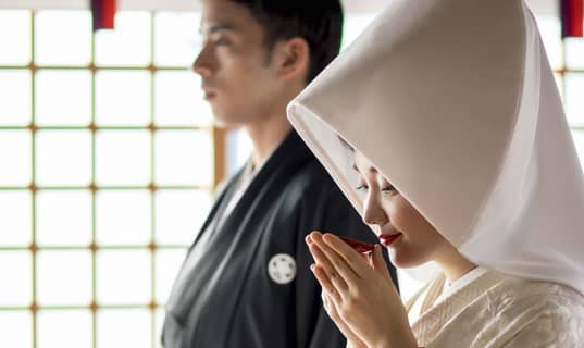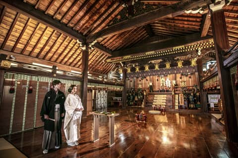 本殿では二人の誓いを奉告参拝する大切な儀式を執り行います。歴史ある荘厳な空間で、挙式での誓いを奉告参拝する瞬間は