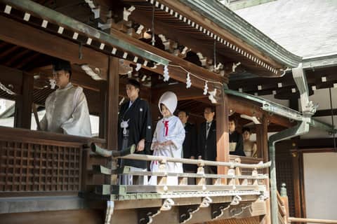 梅花殿にて挙式を納めた新郎新婦と参列者が高床式の回廊を渡り