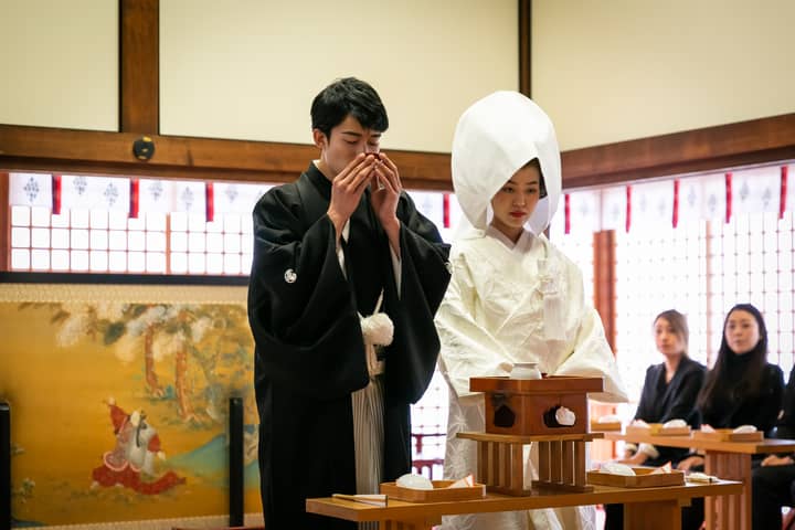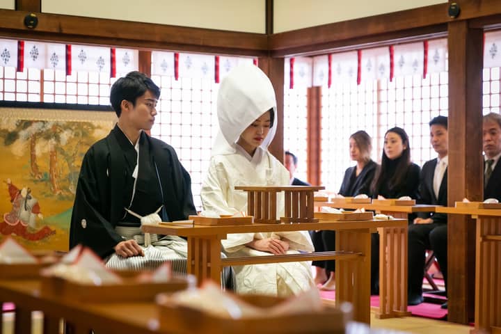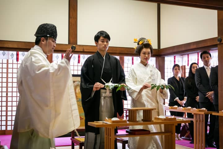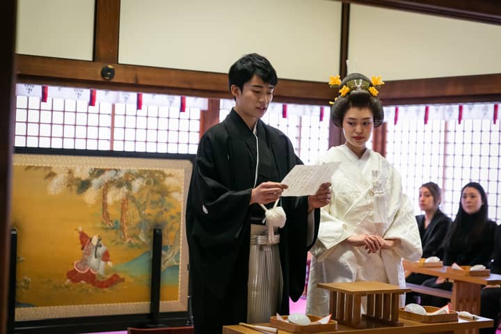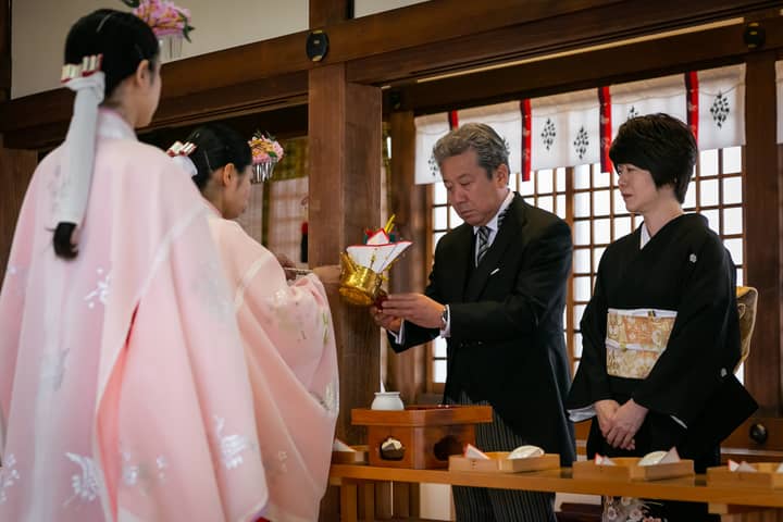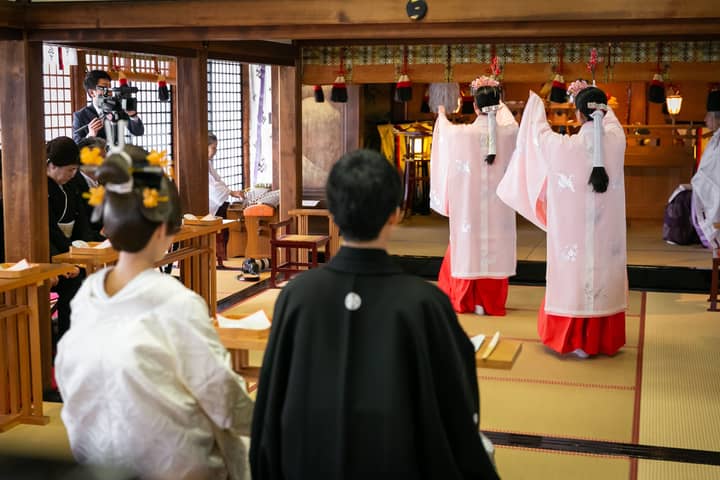 粛々と婚礼の儀は進行します。美しい琴の音色や巫女の舞がお二人を祝福します。