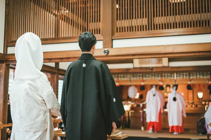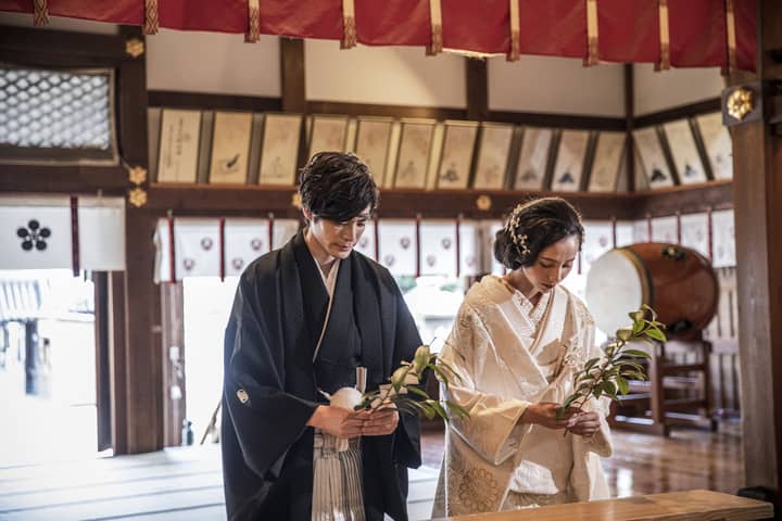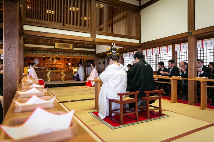 本殿では二人の誓いを奉告参拝する大切な儀式を執り行います。歴史ある荘厳な空間で、挙式での誓いを奉告参拝する瞬間は