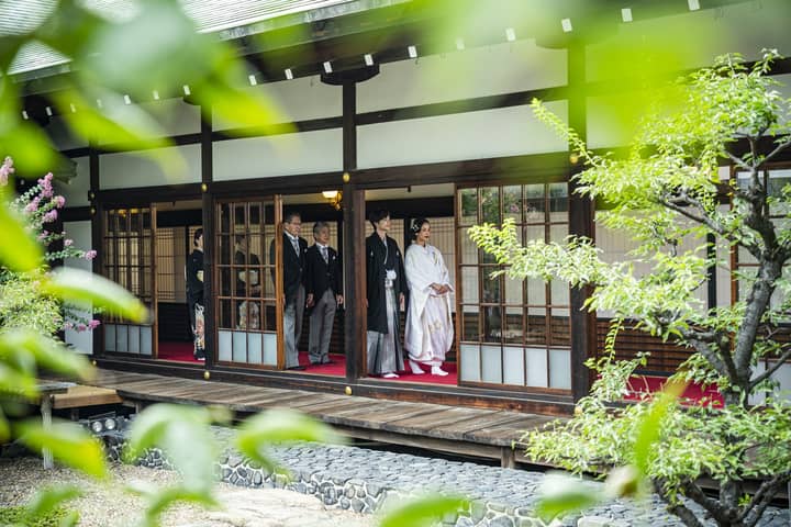 梅花殿にて挙式を納めた新郎新婦と参列者が高床式の回廊を渡り